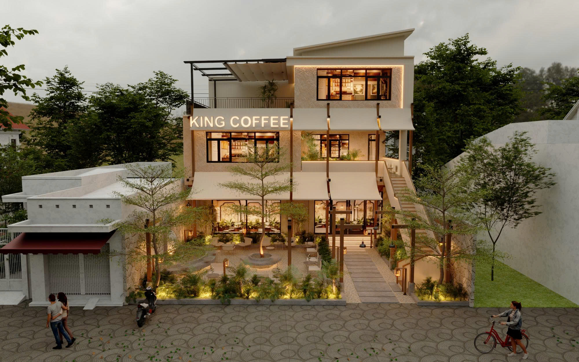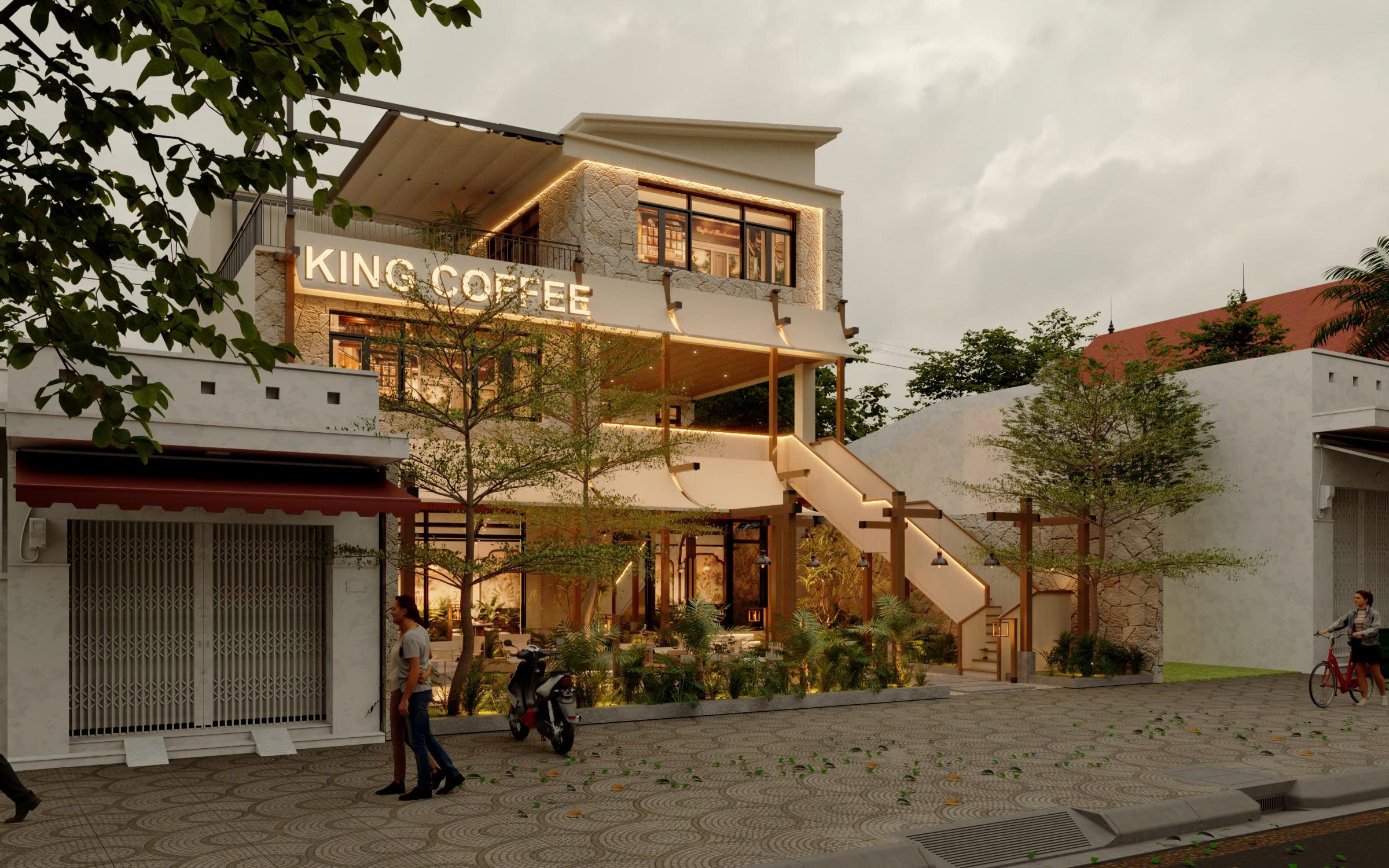 Không gian King Coffee được tổ chức mạch lạc và liền mạch, không hề chia tách cứng nhắc. Khu vực phục vụ, quầy pha chế, sân vườn, và không gian ngồi đều được liên kết bằng lối đi mềm mại, tầm nhìn mở xuyên suốt.