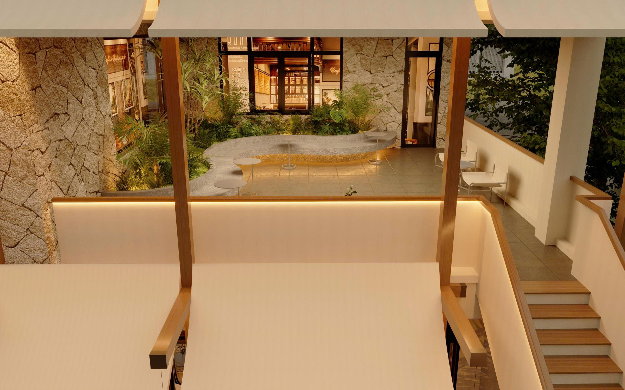 Điểm đặc biệt là sân trung tâm – nơi hội tụ ánh sáng tự nhiên, cây xanh và tiểu cảnh đá. Đây không chỉ là trục kết nối giữa các khu vực mà còn là “linh hồn” của quán, nơi mọi ánh nhìn đều hướng về.