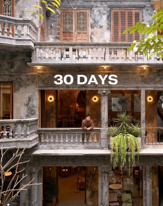 Nằm sâu trong ngõ nhỏ Thành Công (Ba Đình), quán 30 days coffee có mặt bằng rộng hiếm có giữa khu dân cư cổ, ước tính 80-120m² với sân trước thoáng và không gian trong nhà 2 tầng. Mặt tiền ngõ 4-5m nhưng thông hai chiều, bố trí mở hoàn toàn: sân ngoài decor xanh cây cối sức chứa 30-40 khách, bên trong tối ưu lối đi giữa bàn ghế thấp kiểu Nhật chill. Đặc biệt tận dụng chiều cao trần lớn để treo đèn nghệ thuật, tạo cảm giác rộng rãi dù ngõ hẹp; chỗ đỗ xe tận dụng vỉa hè gần đó. Mở cửa từ 2025, quán nhanh chóng viral qua instagram và facebook nhờ concept chill thu hút giới trẻ, dù nằm sâu ngõ nhưng vẫn nhiều khách tìm đến.