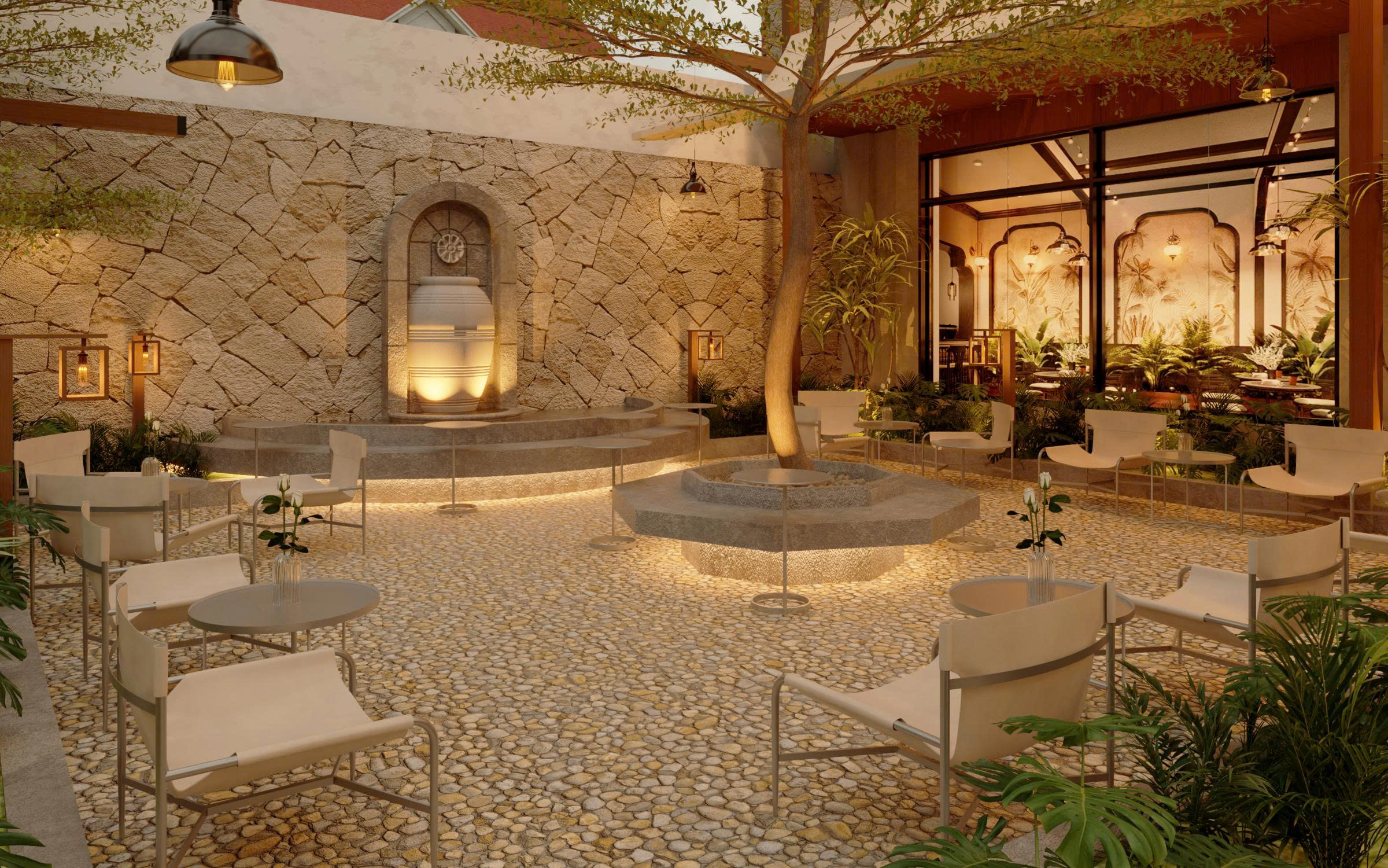 Điểm đặc biệt là sân trung tâm – nơi hội tụ ánh sáng tự nhiên, cây xanh và tiểu cảnh đá. Đây không chỉ là trục kết nối giữa các khu vực mà còn là “linh hồn” của quán, nơi mọi ánh nhìn đều hướng về.