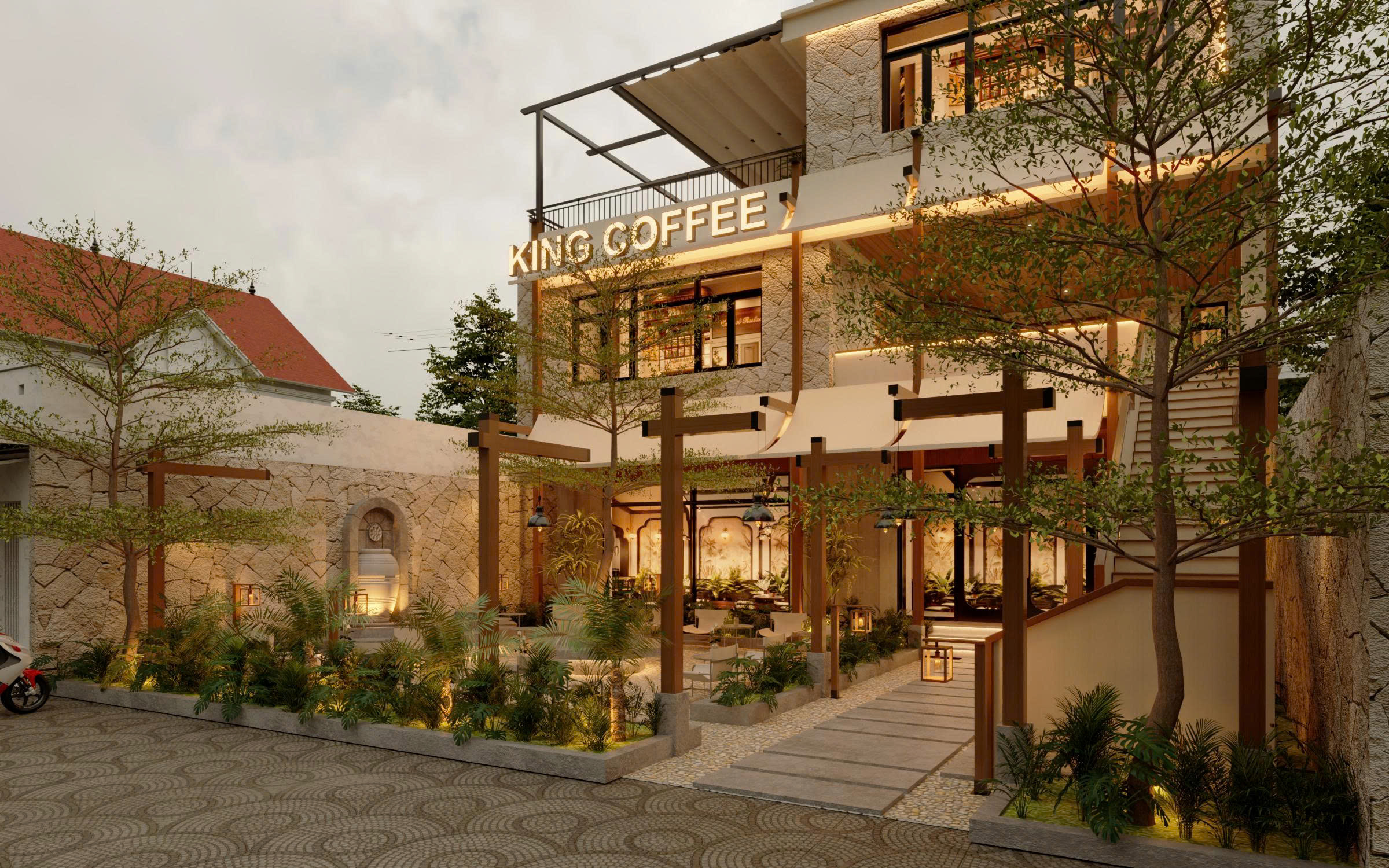 Không gian King Coffee được tổ chức mạch lạc và liền mạch, không hề chia tách cứng nhắc. Khu vực phục vụ, quầy pha chế, sân vườn, và không gian ngồi đều được liên kết bằng lối đi mềm mại, tầm nhìn mở xuyên suốt.