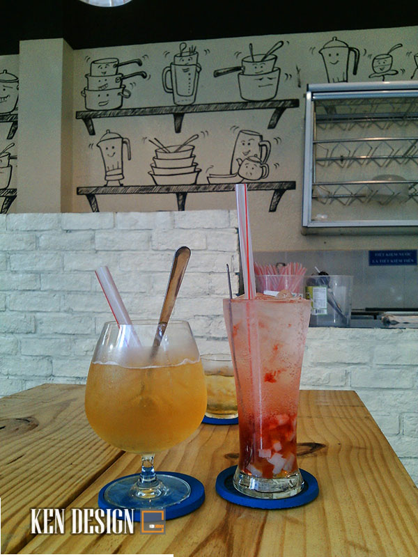 Thiết kế quán trà sữa đẹp tường trắng đơn giản và hình vẽ tay ngộ nghĩnh